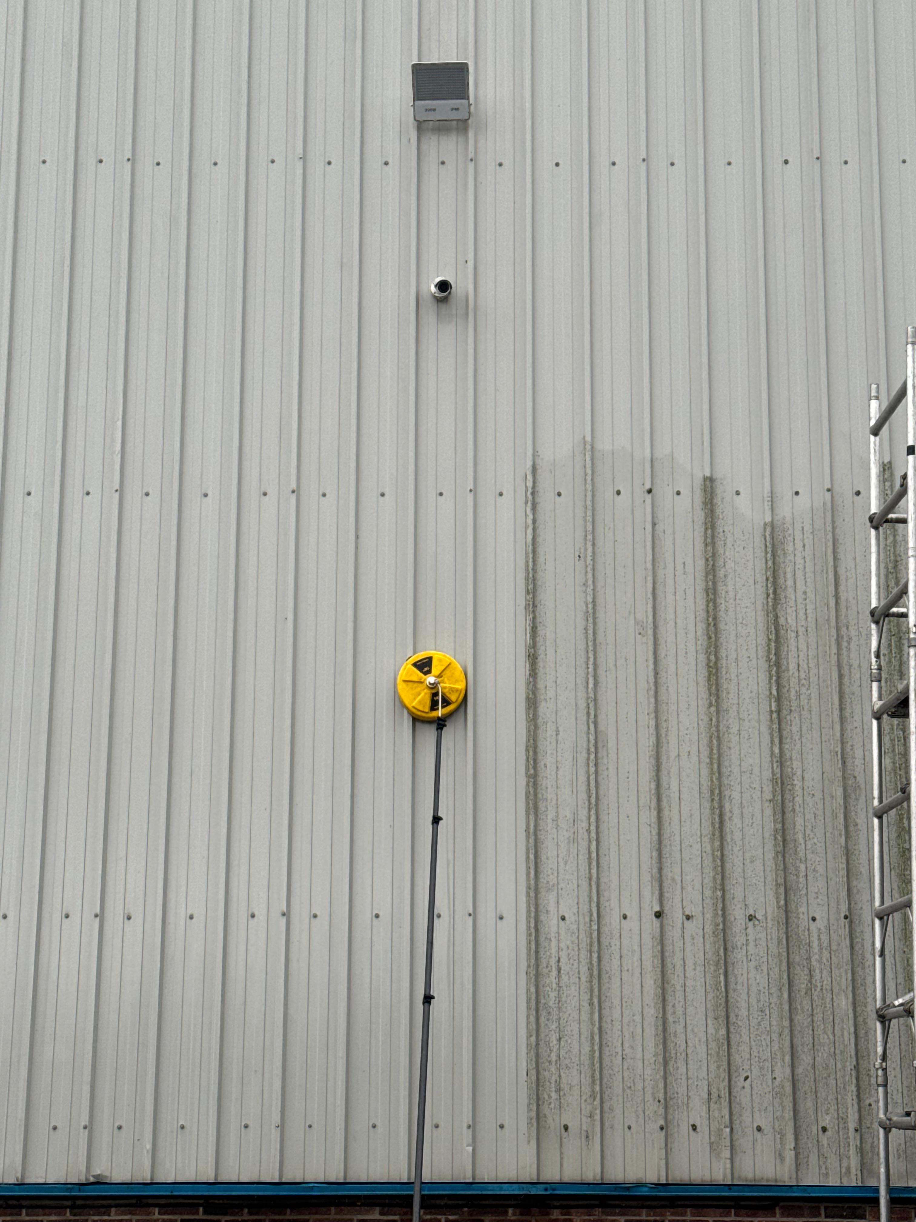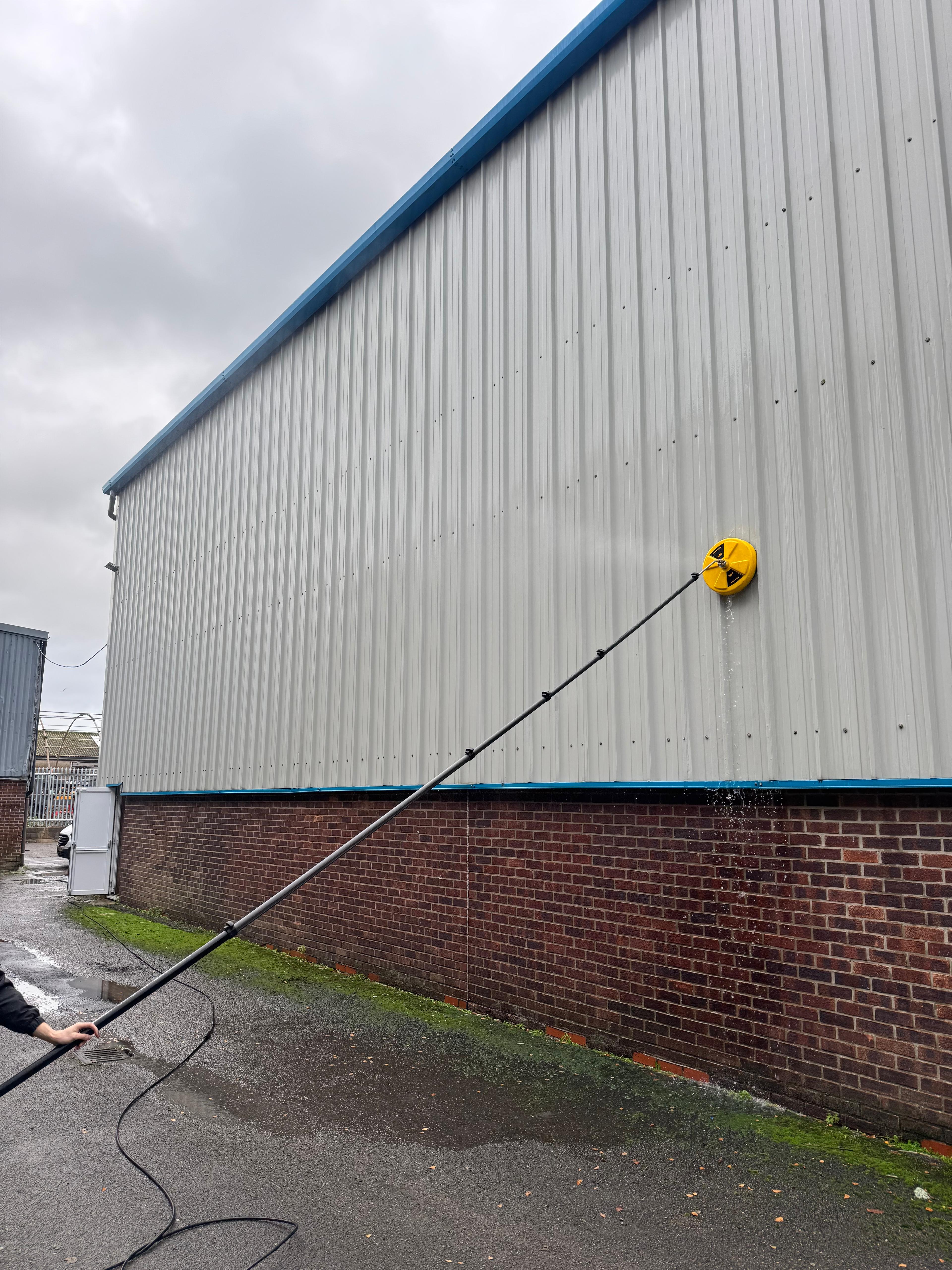 Detailed Cleaning of Building Sides: We apply the same soft bristle technique to the sides of the building, ensuring all areas are thoroughly cleaned for a complete finish.